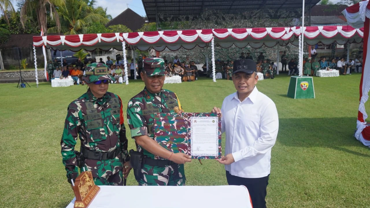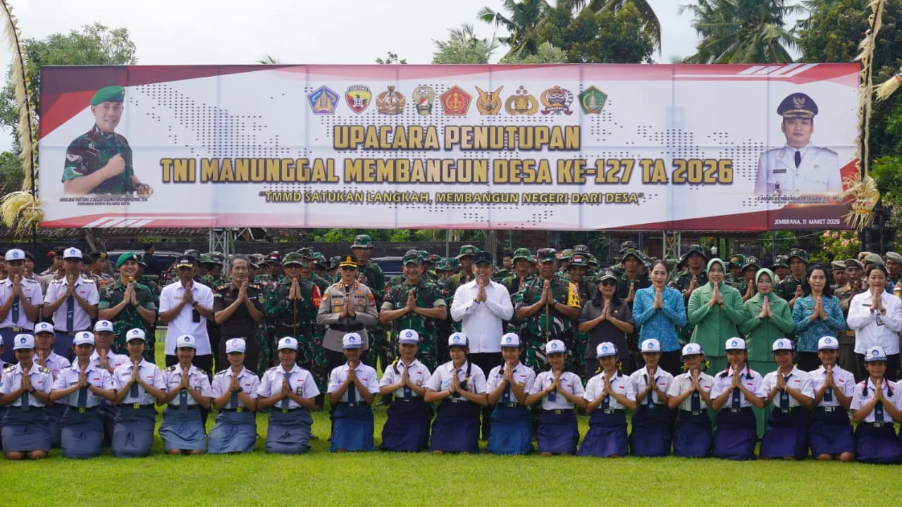 JEMBRANA – Program TNI Manunggal Membangun Desa (TMMD) Ke-127 Tahun 2026 di wilayah Kodim 1617/Jembrana resmi ditutup dengan capaian gemilang. Upacara penutupan yang mengusung tema "Satukan Langkah Membangun Negeri dari Desa" dipimpin langsung oleh Danrem 163/Wira Satya, Brigjen TNI Ida I Dewa Agung Hadisaputra, S.H., bertempat di Lapangan Umum Desa Yehembang, Kecamatan Mendoyo, Rabu (11/3).